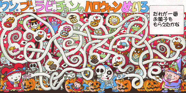 だれが一番お菓子をもらえたかな?迷路をたどってくらべてみようね。 |